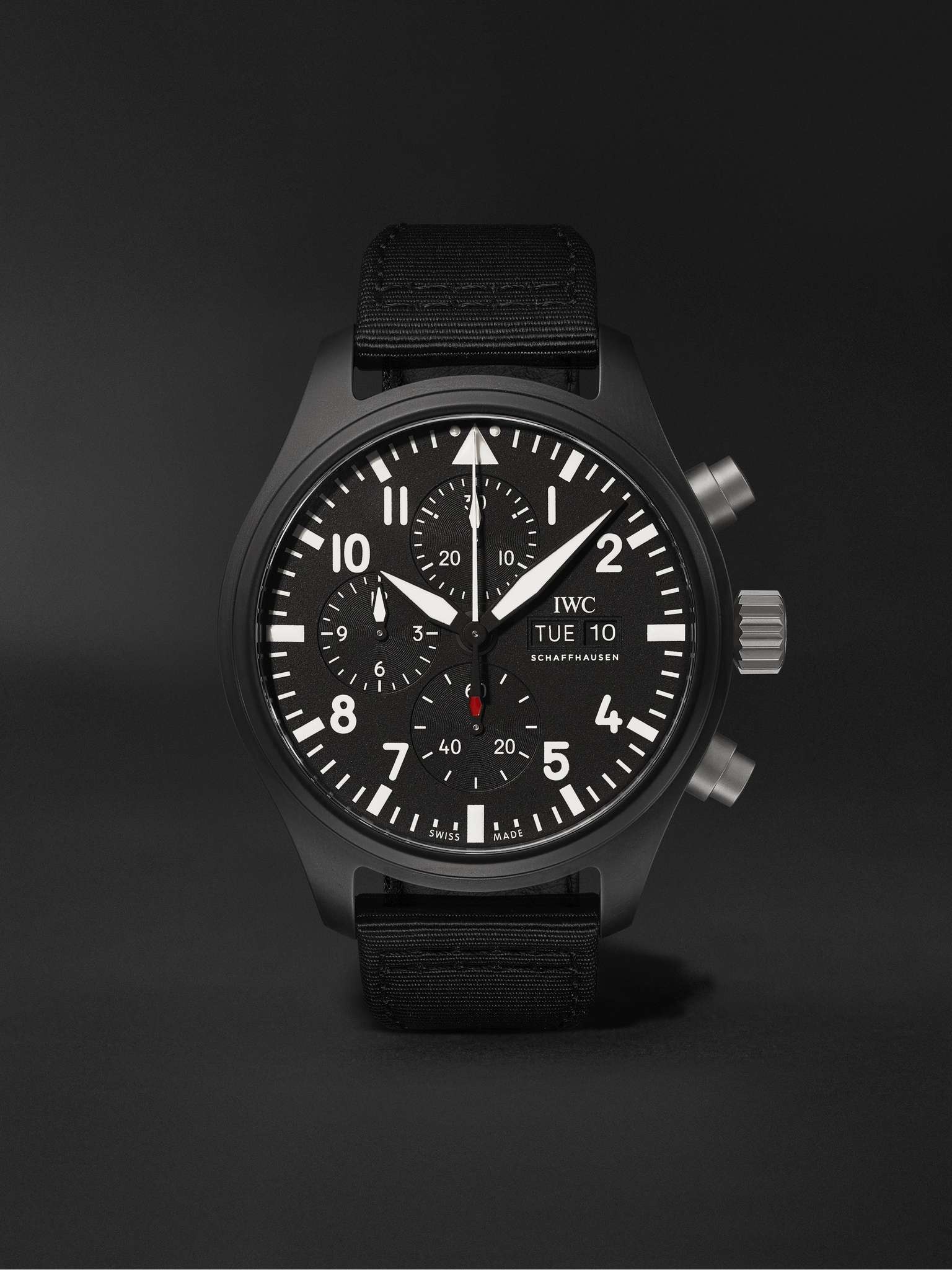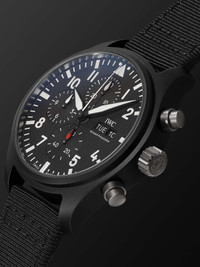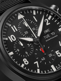 Part of IWC SCHAFFHAUSEN's 'Pilot's' collection, this chronograph watch is crafted from robust, corrosion-resistant matte black ceramic and titanium - it was originally created to withstand the missions of US Navy jet pilots and is engraved with the 'TOP GUN' insignia on the back. It features a stopwatch function, displays the day and date and has 30-minute, 12-hour and second counting sub-dials. The house's precise Swiss-made calibre 69380 automatic movement has been expertly finished using Côtes de Genève and perlage techniques. We offer an eight-year warranty for all working parts and manufacturing faults for IWC SCHAFFHAUSEN watches. For more information, contact one of our experts by emailing watches@mrporter.com Details & Care Movement - Swiss-made calibre 69380 automatic chronograph movement with 46-hour power reserve - 33 jewels, 28,800 Vph Functions - Hour and minute hands, second subdial - Day and date window - Chronograph: sweep second hand, 30-minute and 12-hour subdials Dial - Black dial - White luminescent hands, numerals and indices, red sub-dial hand - Case - Black ceramic case with antimagnetic soft-iron core - Crown for day, date and time adjustment and manual winding - Sapphire glass crystal - Engraved titanium case back - Folding clasp-fastening black textile strap Specifications - Case diameter: 44.5mm; case thickness: 15.7mm; lug width: 21mm - Water resistance: 6 bar - Comes in a presentation box - Reference number: IW389101 - Made in Switzerland