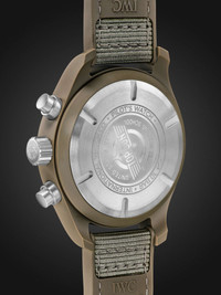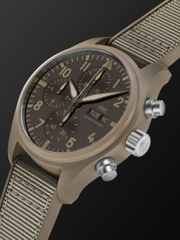 IWC Schaffhausen's 'TOP GUN' collection features its signature 'Pilot's Watch' in military-inspired colourways – this model is a tonal-beige 'Mojave Desert'. Set on a rubber and webbing strap, it has a ceramic case with a brown chronograph dial and luminous hands, numerals and indices for legibility. Inside ticks a calibre 69380 automatic movement that's been manufactured in-house. For warranty information, please refer to details & care Details & Care Movement - Swiss-made calibre 69380 automatic chronograph movement with 46-hour power reserve - 33 jewels, 28,800 Vph Functions - Hour, minute and small hacking seconds hands - Date and day windows - Chronograph: 60-second, 30-minute and 12-hour counters Dial - Brown dial - Brown luminous stainless steel hands, Arabic numerals, indices and markers - Case - Beige stainless steel case - Crown for date and time adjustments and manual winding - Sapphire glass crystal - Engraved case back - Pin buckle-fastening beige rubber and grosgrain strap Specifications - Case diameter: 41.9mm; case thickness: 15.5mm; strap width: 20mm - Water resistance: 10 bar - Comes in a presentation box - Reference number: IWIW389402 We offer an eight-year warranty for all working parts and manufacturing faults for IWC Schaffhausen watches. For more information, contact one of our experts by emailing watches@mrporter.com