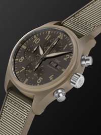 IWC Schaffhausen's 'TOP GUN' collection features its signature 'Pilot's Watch' in military-inspired colourways – this model is a tonal-beige 'Mojave Desert'. Set on a rubber and webbing strap, it has a ceramic case with a brown chronograph dial and luminous hands, numerals and indices for legibility. Inside ticks a calibre 69380 automatic movement that's been manufactured in-house. For warranty information, please refer to details & care Details & Care Movement - Swiss-made calibre 69380 automatic chronograph movement with 46-hour power reserve - 33 jewels, 28,800 Vph Functions - Hour, minute and small hacking seconds hands - Date and day windows - Chronograph: 60-second, 30-minute and 12-hour counters Dial - Brown dial - Brown luminous stainless steel hands, Arabic numerals, indices and markers Case - Beige stainless steel case - Crown for date and time adjustments and manual winding - Sapphire glass crystal - Engraved case back - Pin buckle-fastening beige rubber and grosgrain strap Specifications - Case diameter: 41.9mm; case thickness: 15.5mm; strap width: 20mm - Water resistance: 10 bar - Comes in a presentation box - Reference number: IWIW389402 We offer an eight-year warranty for all working parts and manufacturing faults for IWC Schaffhausen watches. For more information, contact one of our experts by emailing watches@mrporter.com