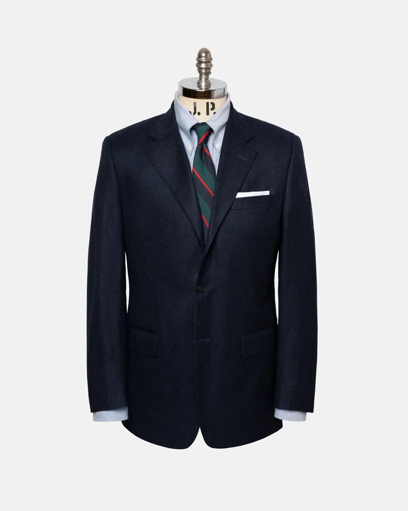 - Classic Fit - 100% Wool Flannel Woven in Italy - 3 Button Sack Model - Hook Center Vent - 1/16" Edge Stitching - Bemberg Lining - Flat Front Trousers - Dry Clean Only - Made in Canada