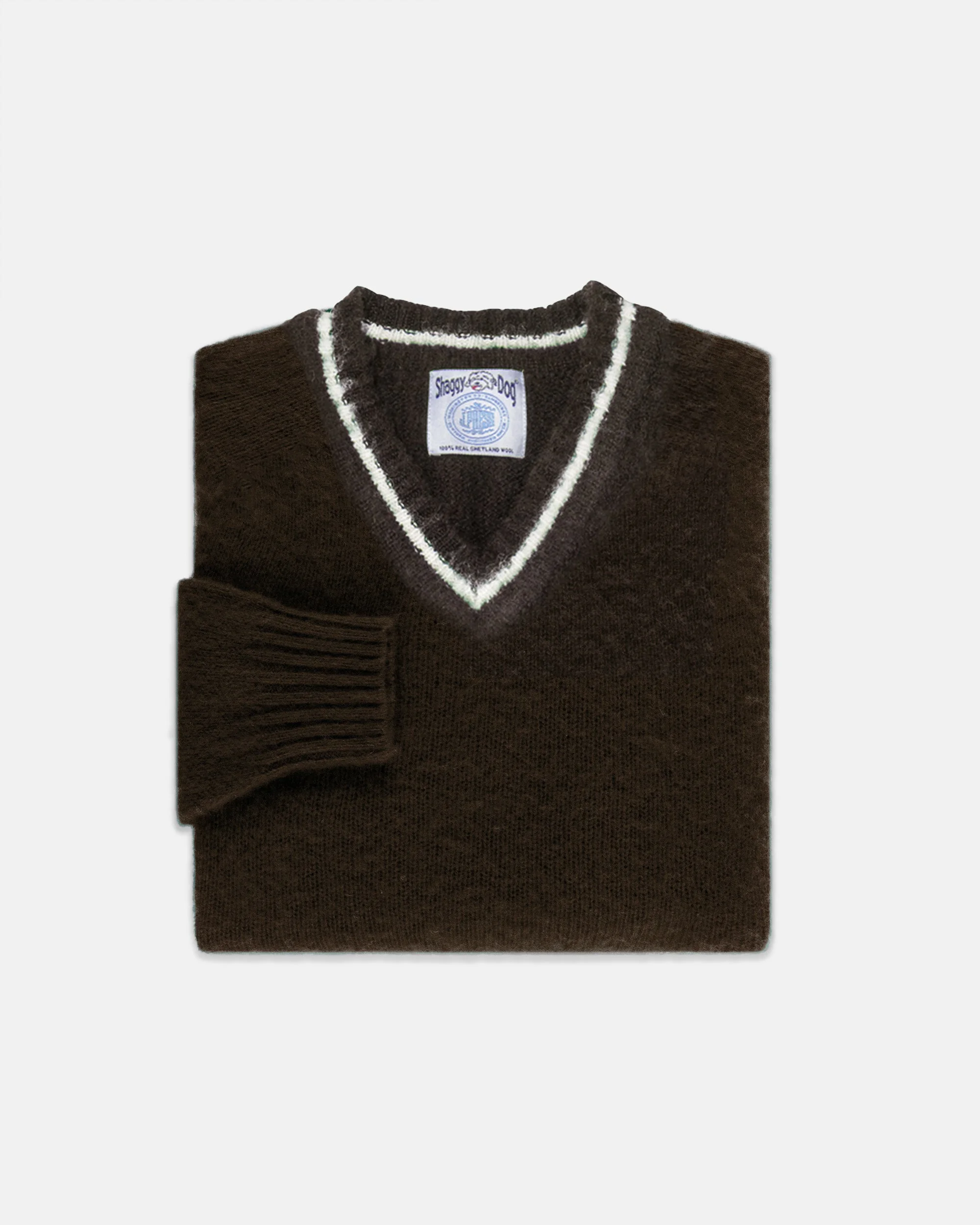 MADE-IN-SCOTLAND BROWN SHAGGY DOG V-NECK SWEATER - TRIM FIT