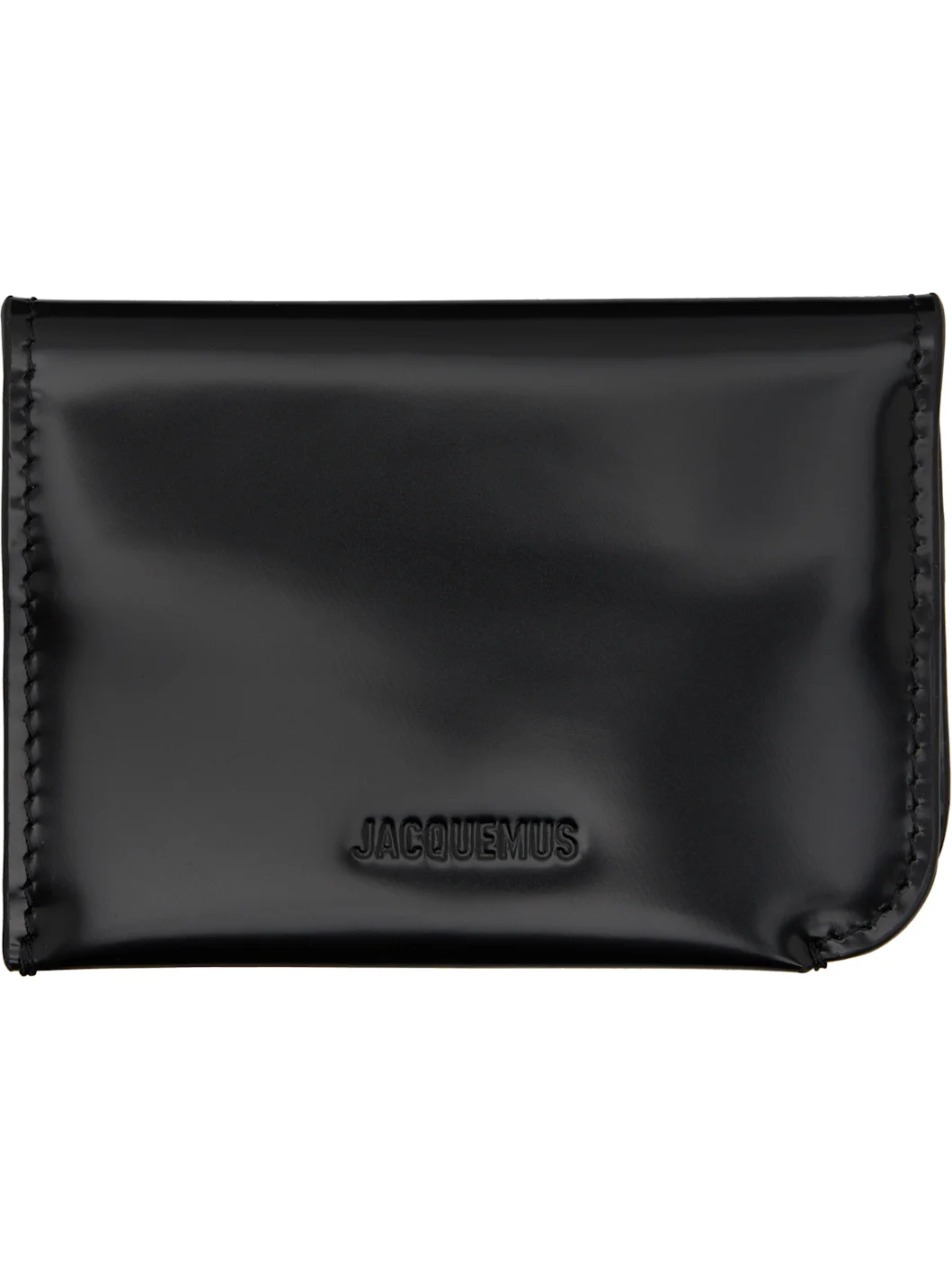 Grained calfskin bifold card holder. · Logo embossed at face · Four card slots at interior · Buffed lambskin lining · H3" x W4" x D0.5" Supplier color: Black Body: 100% calfskin. Lining: 100% lambskin. Made in Spain 252553M163000