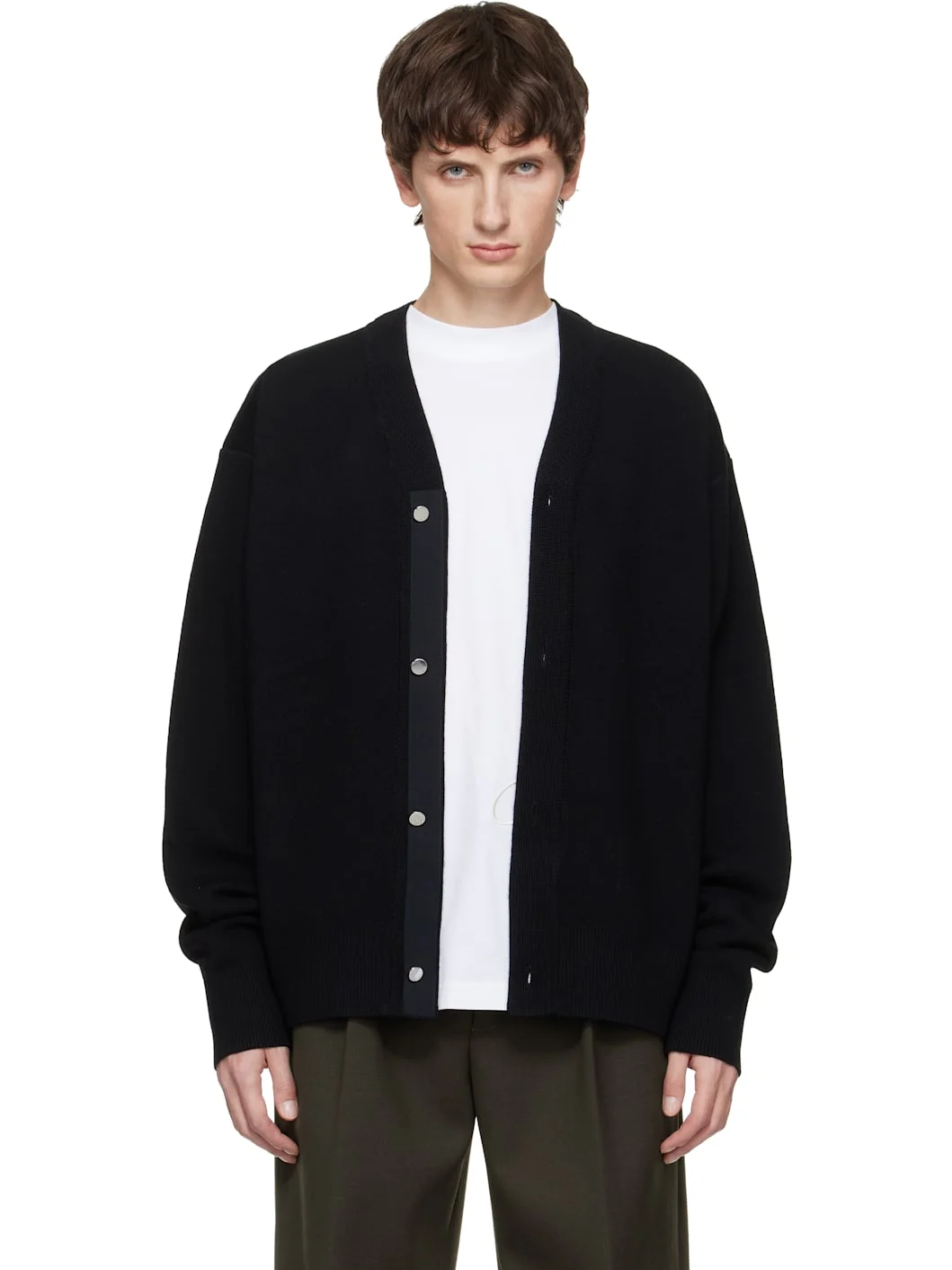 Heavyweight knit merino wool-blend cardigan. · Boxy-fit · Rib-knit V-neck, hem, and cuffs · Button closure · Dropped shoulders · Locker loop at back collar · Logo-engraved silver-tone hardware Supplier color: Black 96% merino wool, 4% polyamide. Made in Portugal 252553M200003