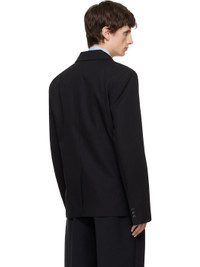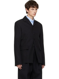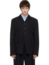 Virgin wool barathea blazer. · Notched lapel · Button closure · Flap pockets · Padded shoulders · Surgeon's cuffs · Logo patch at cuff · Central vent at back hem · Welt pockets at interior · Full viscose- and cotton-blend twill lining · Horn hardware Supplier color: Black Body: 100% virgin wool. Lining: 52% viscose, 48% cotton. Made in Romania 252553M195001