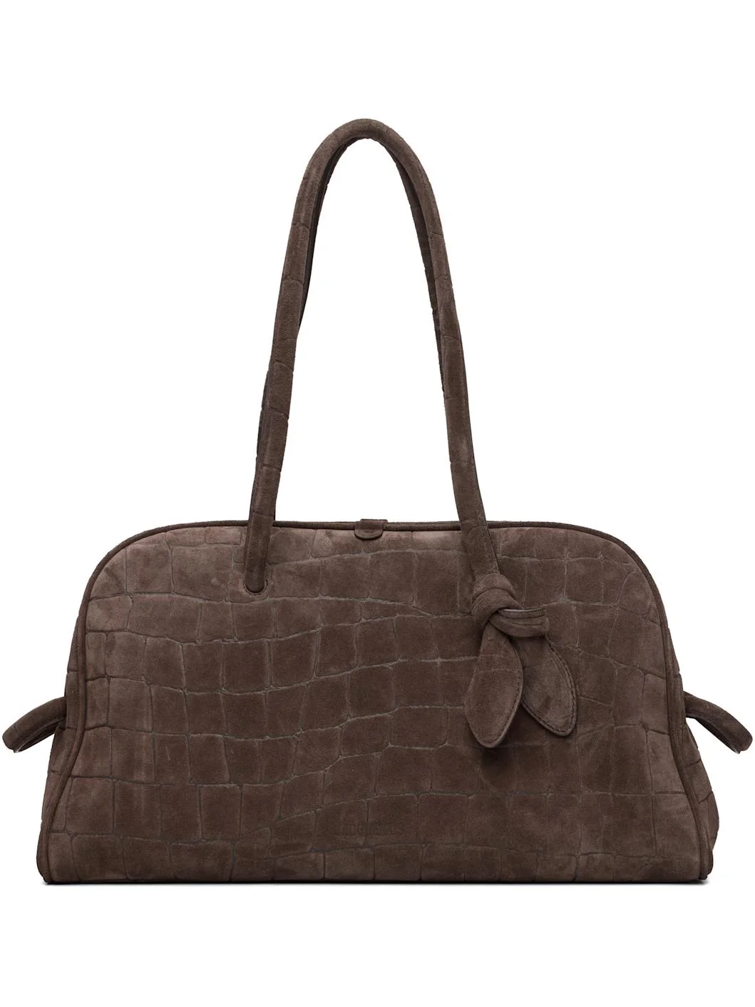Croc-embossed calfskin suede messenger bag. · Rolled shoulder straps · Knotted detailing at strap base · Logo embossed at face · Strap at sides · Magnetic fastening at top · Zip closure · Zip pocket at interior · Cotton twill lining · H9" x W15" x D7" Supplier color: Dark Brown Calfskin. Made in Italy 252553M170009