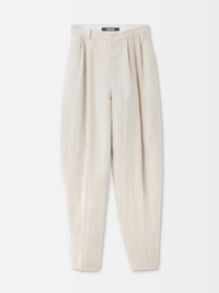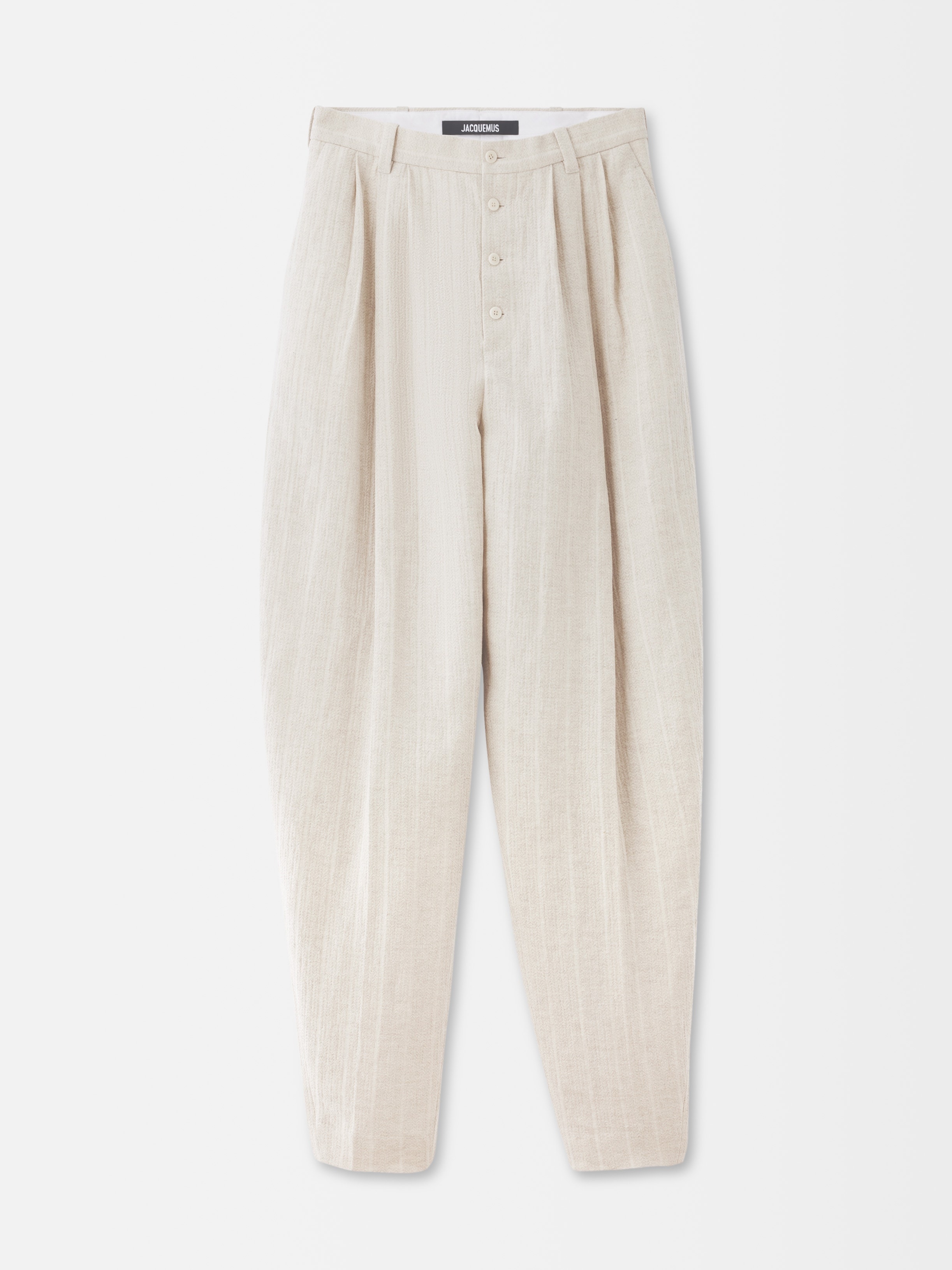 High-waisted buttoned pants - High-rise - Textured cotton-linen - Belt loops including a "J" loop - Visible buttoned fly - Side-seam pockets - Long and wide curved leg - Double pressed-pleats - Buttoned flap pocket in the back - Horn buttons The model is 188cm and wears a size 48 Made in Bulgaria Ref. PAM00133AW007041KE