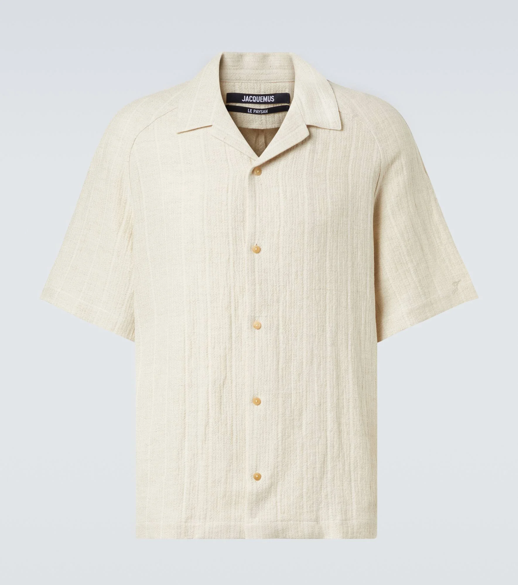 The Fonccio jacquard bowling shirt from Jacquemus is crafted from cotton and linen. This ribbed-knit notch lapel shirt has a loose fit and features mother-of-pearl buttons and an embroidered letter J on the sleeve. Product Details - Material: 64% cotton, 36% linen - Care instructions: hand wash - Made in Portugal - Designer color name: Rib Knit LIght Beige - Item color: beige - Cuban collar shirt - Closure: buttoned front - Item number: P01057790 Size & Fit - True to size - Designed for a loose fit - Non-stretchy fabric - Falls below the hip - The model in the picture is 185cm-6'1" and wearing a size IT 50