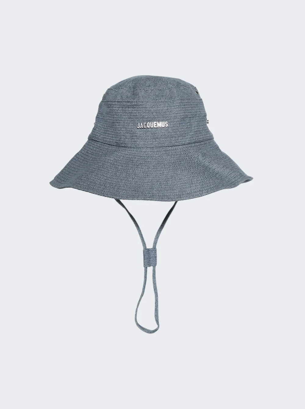 Details - Stitched denim bucket hat - Long, adjustable strap - Topstitched visor - Side snaps - Circle and square ventilation grommets - Circle and square loop drawstring at back - Silver metal logo - Material: 100% Cotton Vendor Color Code: Brand Style: ACU00721AD00042 Designer/Brand: JACQUEMUS