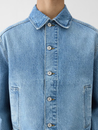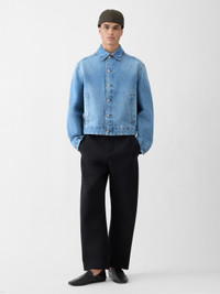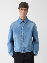 Short denim jacket - Short straight fit - Faded indigo denim - Pointed collar - Engraved metal buttons - Buttoned cuffs - Two welt pockets - Silver metal hardware - Contrasting stitching The model is 187cm and wears a size 48 100% Cotton / Lining : 65% Polyester - 35% Cotton Made in Italy Ref. OUM00155AD0003833C
