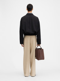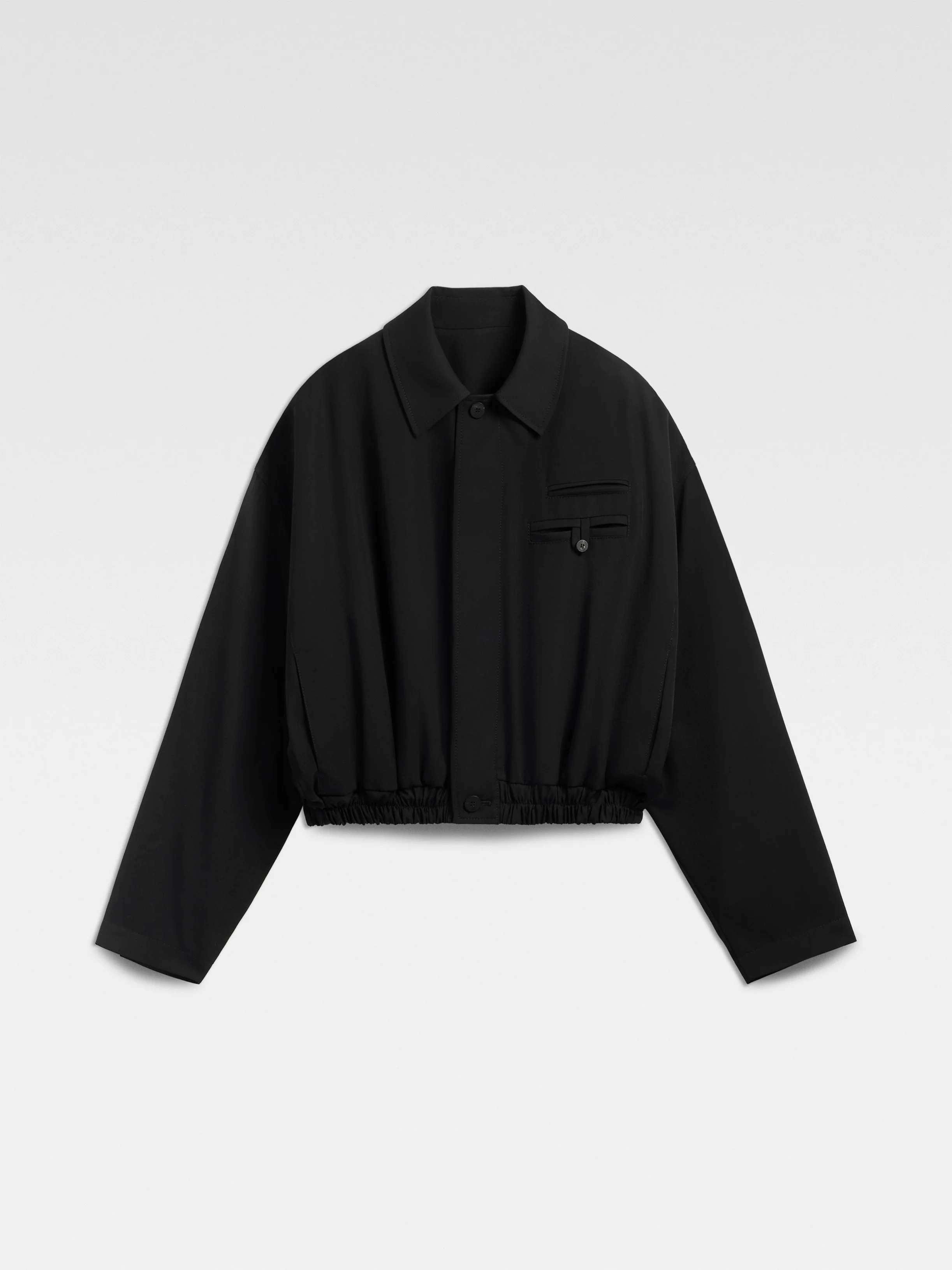 Blouson jacket - Short oversized fit - Wool suiting fabric - Pointed collar - Long sleeves - Hidden button closure with two visible buttons - Buttoned jet pockets - “J" button loop - Side pockets - Buttoned cuffs - Box pleat in the back - Elasticated hem - Corozo buttons The model is 190cm and wears a size 48 100% Virgin wool / Lining: 100% Cotton Made in Bulgaria Ref. 255CO072-1541-990