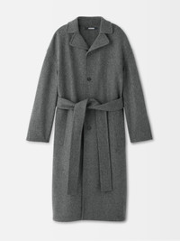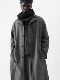 Long belted coat - Long relaxed fit - Compact heathered wool - Notched lapel - Rounded shoulders - Tied belt with belt loops - Welt pockets - Unlined - Horn buttons The model is 187cm and wears a size 48 77% Virgin Wool - 22% Polyamide - 1% Elastane / Lining: 55% Cotton - 45% Polyester Made in Bulgaria Ref. COM00087AW00668970