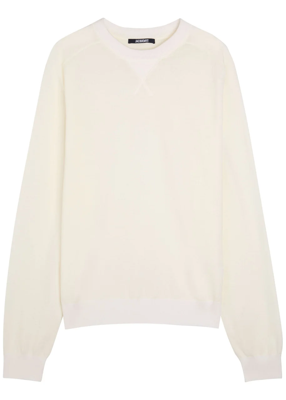 Info & Care Jacquemus fine-knit jumper Round-neck, raglan sleeves, logo embroidery at back, ribbed trims Slips on 96% merino wool, 4% polyamide Hand wash Size & Fit Length shoulder to hem: 26 inches/ 66cm Midweight Regular fit Model is 6'1"/ 185cm, chest size 38.5 inches and wears a size medium