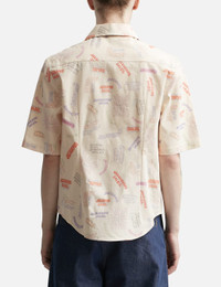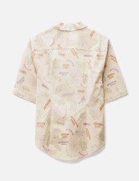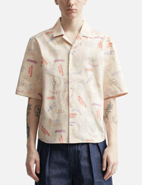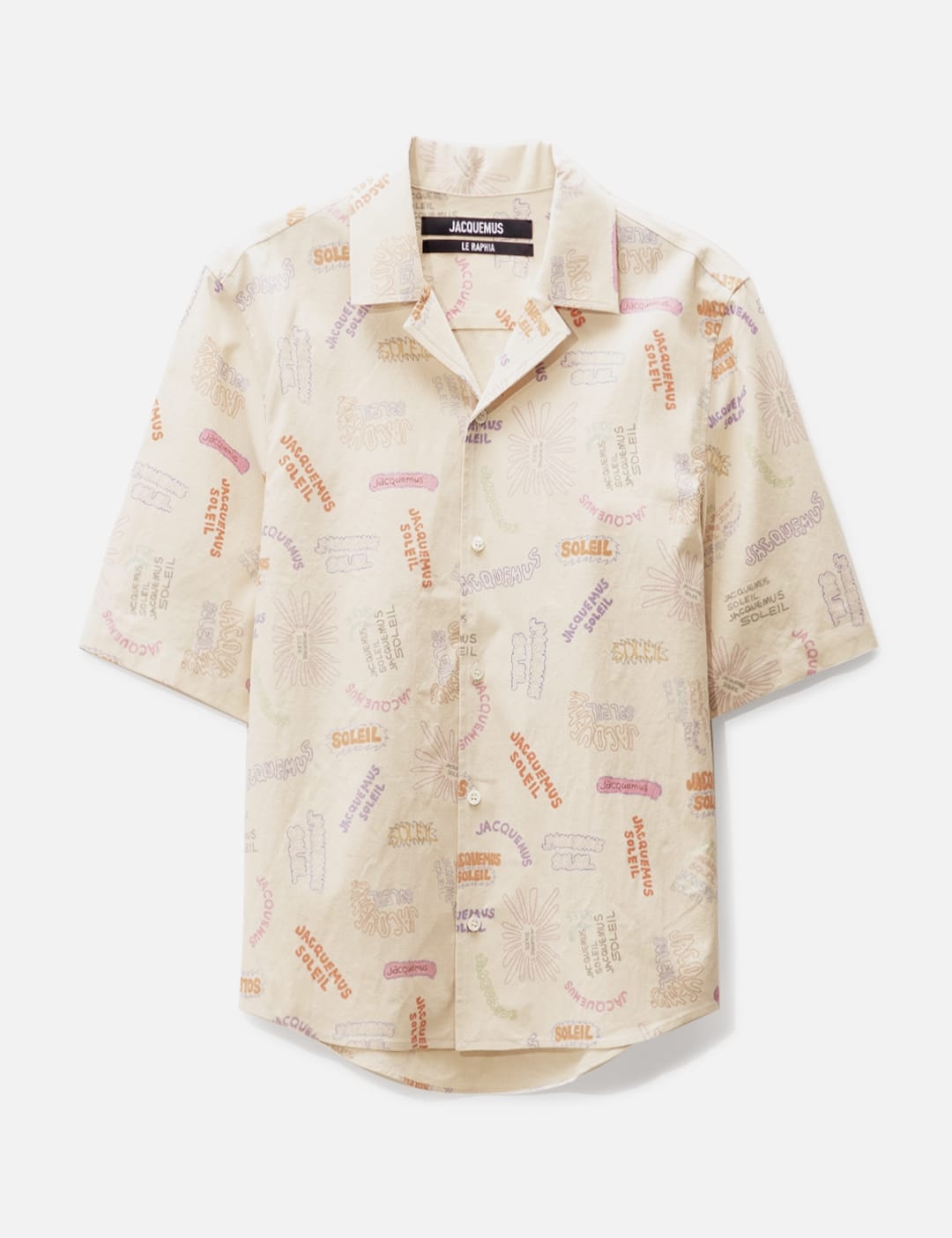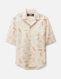 - Jacquemus - La Chemise Aouro - Canvas exterior - Camp collar - Doodle style branding printed allover - Button closure - Short sleeves - Curved hem - Color: Print Multi Tags - Material: 100% Cotton - See more Shirts and Clothing SIZING - Model wears size 48 - Model measures: Height 190cm, Chest 34”/84cm, Waist 28”/70cm, Hip 35”/90cm