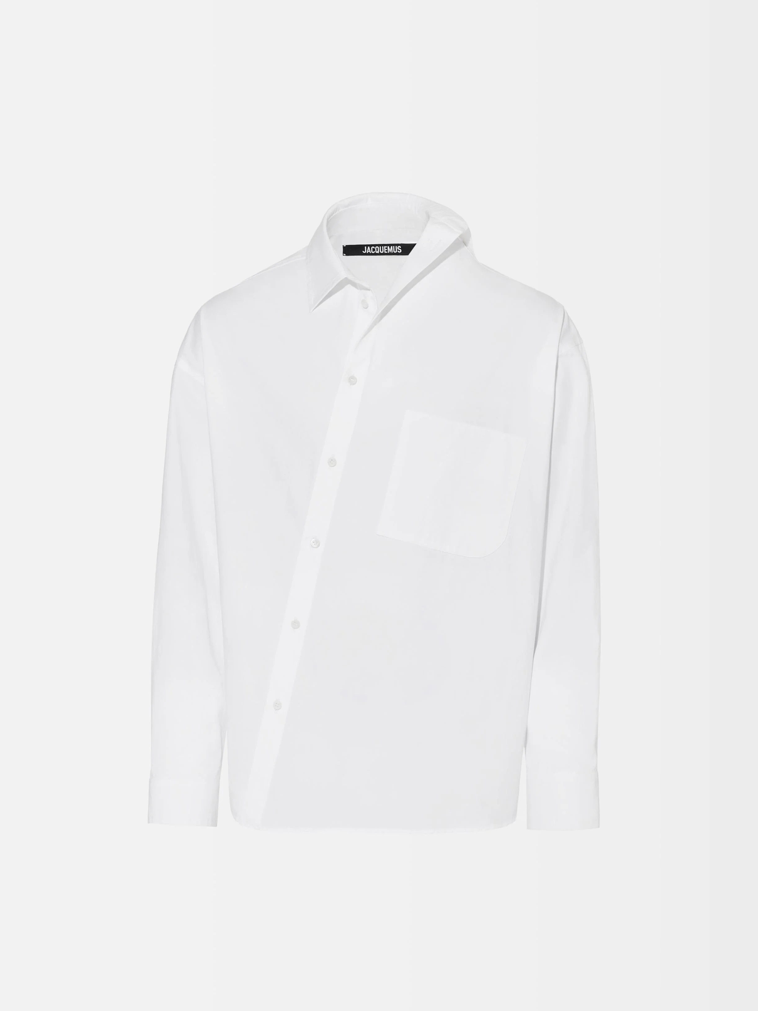 LES SCULPTURES Asymmetric shirt - Oversized asymmetric fit - Cotton poplin - Asymmetric pointed collar - Asymmetric “J” shaped chest pocket - Asymmetric button placket - Square cuffs - Engraved mother-of-pearl buttons - “J” locker loop The model is 186 cm and wears a size 48 100% Cotton Made in Bulgaria Ref.245SH080-1520-100