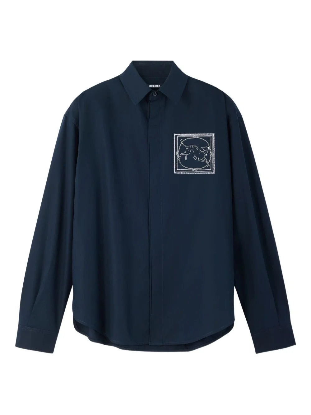 The Simon long-sleeve shirt Highlights - Navy blue - Cotton poplin - Embroidered dog - Framed design - Long sleeves - Button fastening - Pointed collar - Embroidered logo on the collar - Mother-of-pearl buttons - Pearls should be the last thing that you put on in the morning and the first thing you take off at night. avoid contact with perfumes or creams, and simply wipe with a soft cloth to clean. Made in France Composition Cotton 100% Washing instructions Read Manufacturer Guidelines