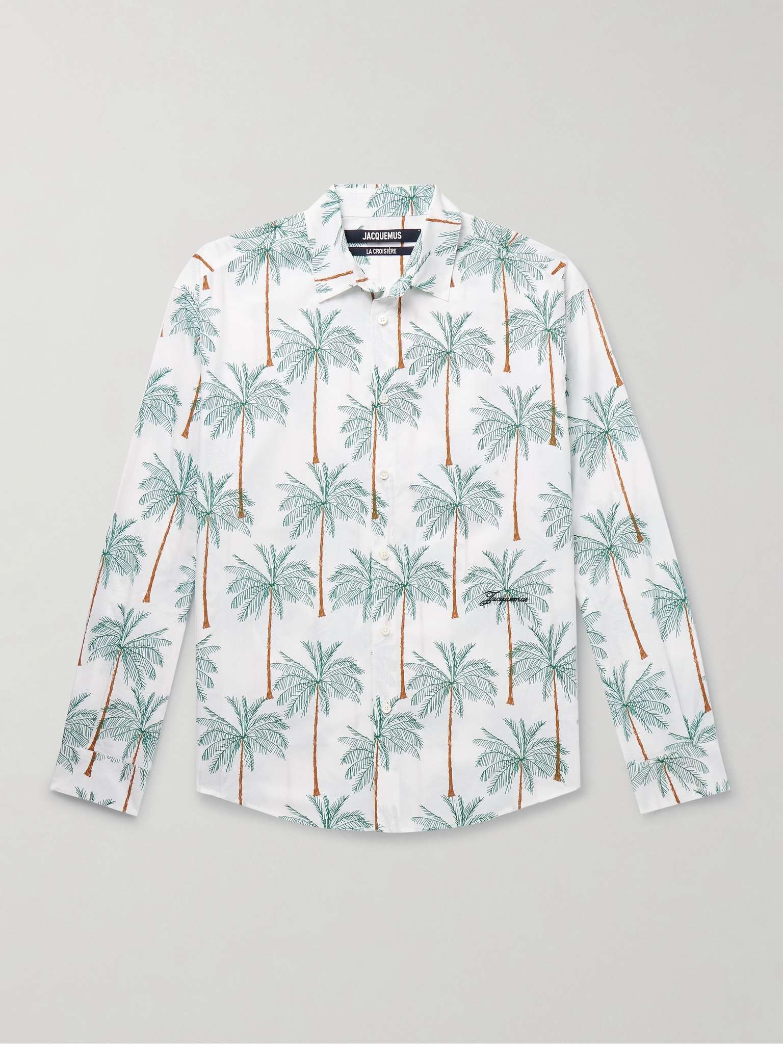 The 'Simon' shirt is a Jacquemus signature, updated in different fabrics and prints every season. From the 'La Croisiere' collections, this version is cut from lightweight cotton-poplin, patterned with playful palm trees and embroidered with a scripted logo. Size & Fit - Fits true to size. Take your normal size - Designed for a relaxed fit - Lightweight, non-stretchy fabric - Model is shown wearing an IT 48 - Model measures: chest 38"/ 96cm, height 6'1"/ 185cm Details & Care - White, green and brown cotton-poplin - Button fastenings - 100% cotton - Machine wash