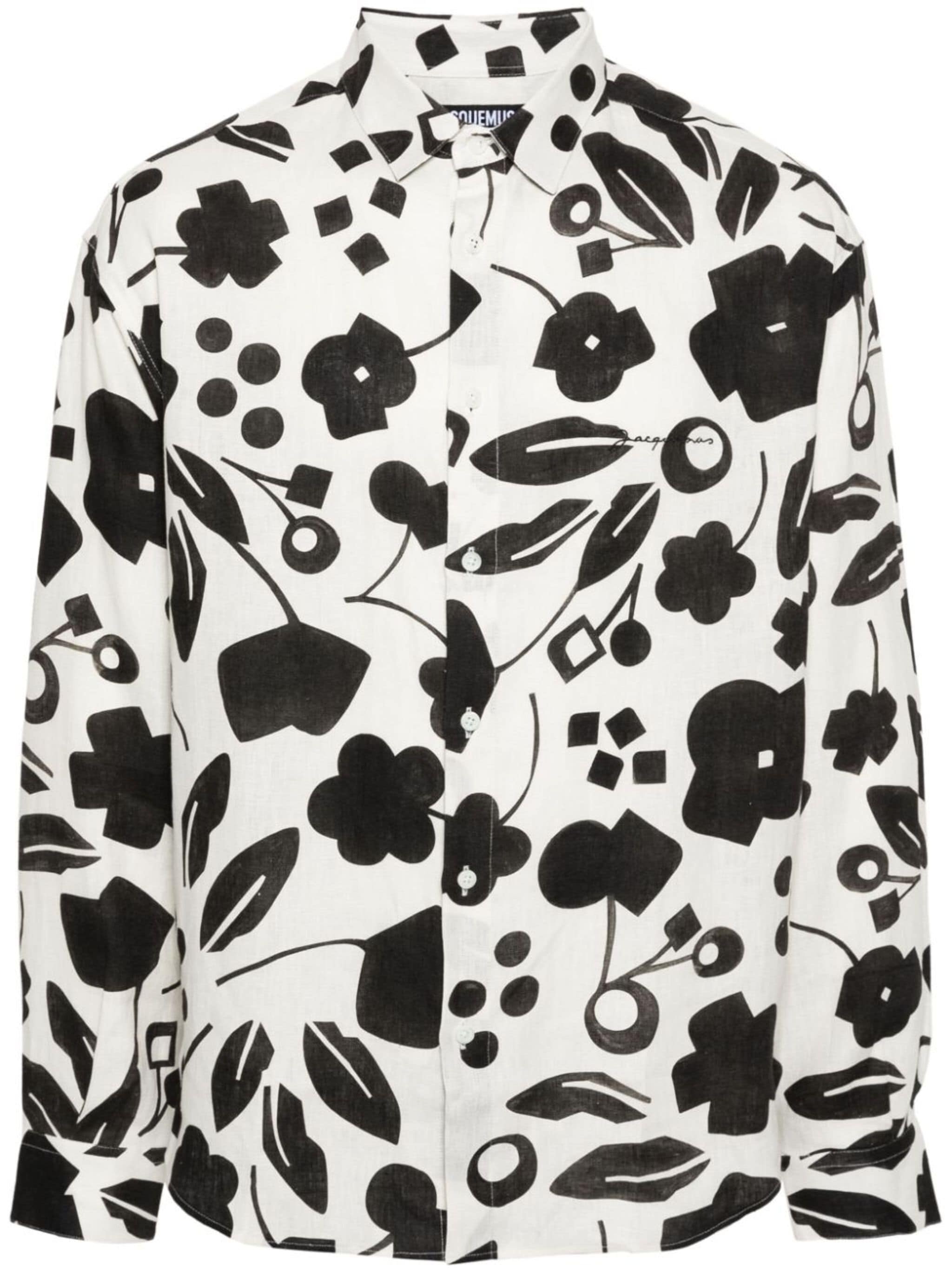 white/black linen/flax cheesecloth all-over graphic print classic collar long sleeves buttoned cuffs curved hem unlined front button placket This item contains at least 50% materials which are certified or widely recognised as having a lower environmental impact through production and/or manufacturing processes that reduce water consumption and the use of harmful chemicals, or re-use by-products of the production process. Learn more about what makes a product Conscious on our Conscious Criteria page Size & Fit Model Measurements: Height: 1.84 m Bust/Chest: 90.0 cm Hips: 96.0 cm Waist: 72.0 cm Model wears size 48 Fabric and Care Designer Style ID: 245SH0011050 Designer Colour: 1HC - PT BLACK WHITE CUBIC FLOW Composition: Linen/flax 100% Washing instructions: Machine Wash Made in Portugal