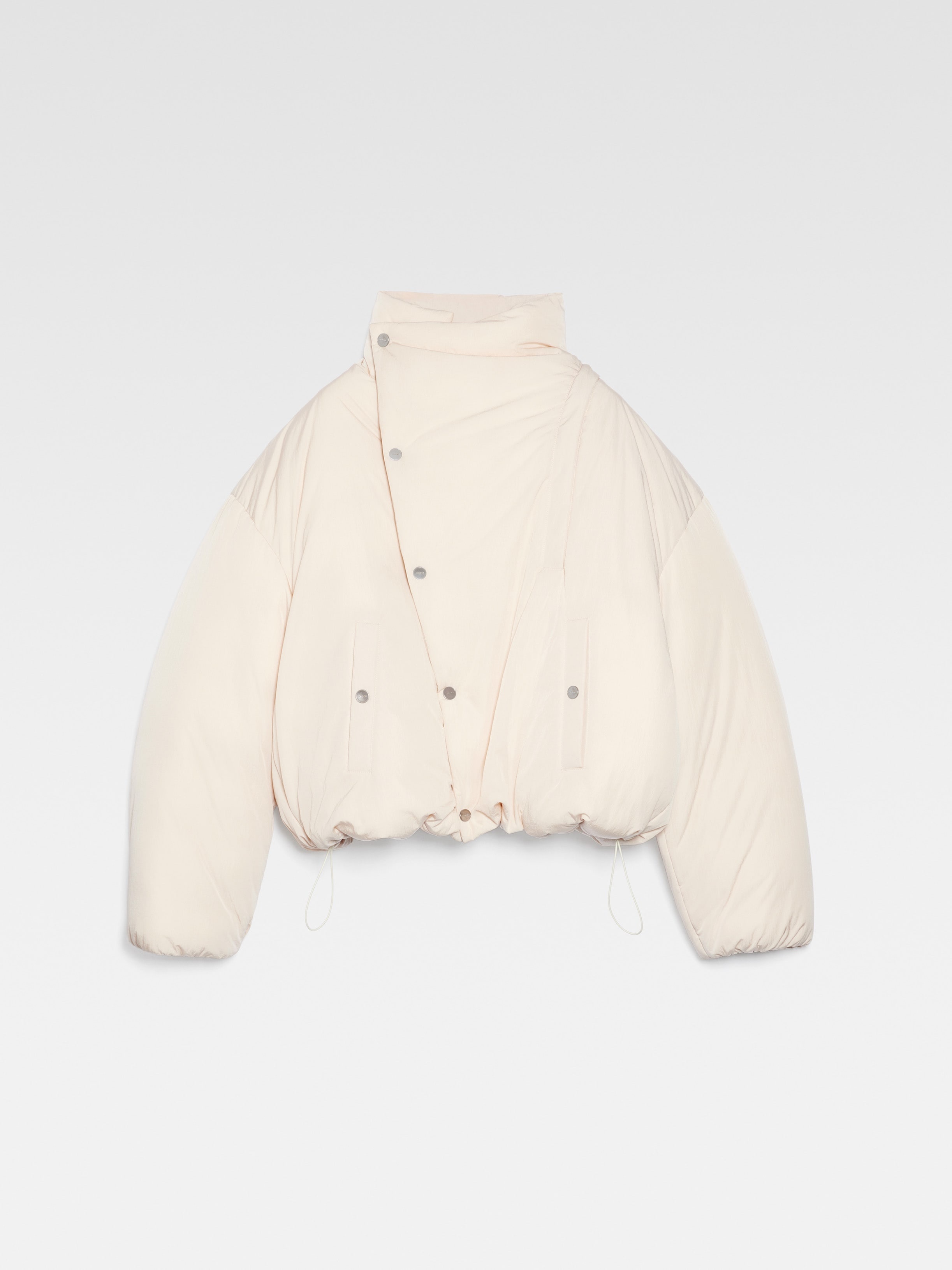 LE CHOUCHOU Cocoon puffer - Cropped, round fit - Water-repellent nylon with a wadded interior - Asymmetric stand-up collar - Zipped closure with snap button placket - Elasticated cuffs - Side welt pockets with snap buttons - Drawstring hem - Grosgrain logo ribbon on the back The model is 186 cm and wears a size 48. 100% Polyamide / Lining : 100% Polyamide Made in Tunisia Ref.236BL027-1320-110