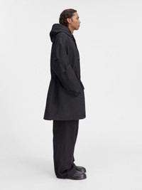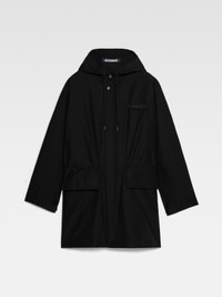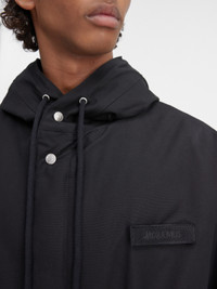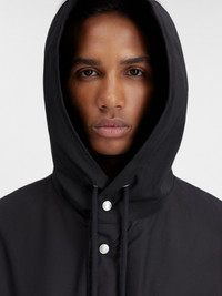 Les Classiques Hooded parka - Straight mid-length fit - Water-repellent cotton and nylon with a wadded interior - Hood with drawstring and square metal end caps - Velcro logo patch - Rounded sleeves with elbow pleats - Metal zipper and snap fasteners - Adjustable drawstring waist - Silver hardware - Side flap pocket with snap fasteners - Fully lined The model is 183 cm and wears a size 50 100% Polyamide - 100% Cotton - 100% Polyester / Lining: 100% Polyamide Made in Tunisia Ref.245CO017-1517-990
