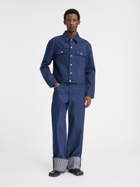 LA CASA Denim jacket - Straight fit - Raw indigo denim - Pointed collar - Engraved metal buttons - Denim patch pockets - Buttoned cuffs - Front and back yoke - Buttoned tab on the back hem - Silver metal hardware - Large leather denim patch - Contrast stitching The model is 188cm and wears a size 48 100% Cotton Made in Portugal Ref. 246DE067-1513-38F