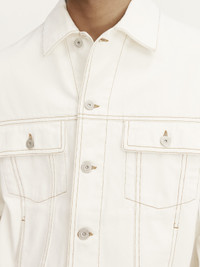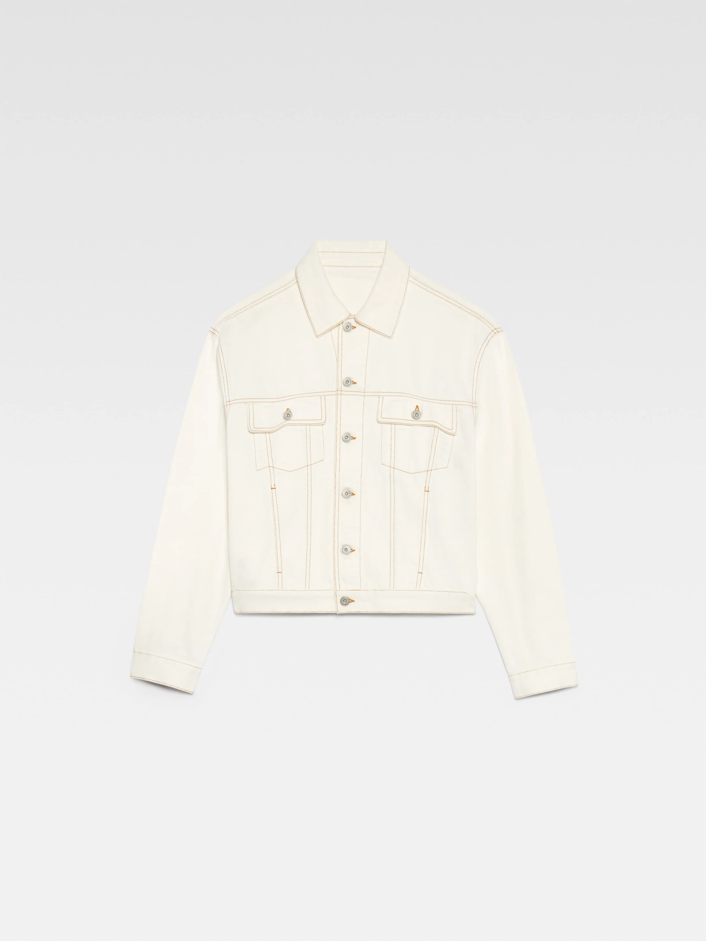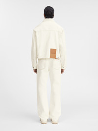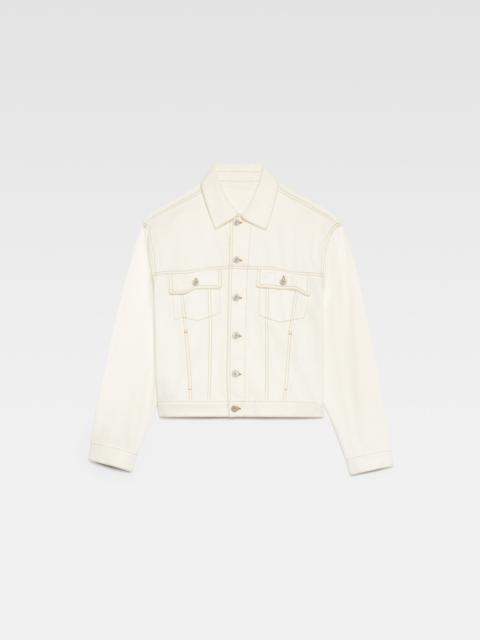 Les Classiques Denim jacket - Straight cut - Raw denim - Pointed collar - Engraved metal buttons - Denim patch pockets - Buttoned cuffs - Front and back yoke - Buttoned tab on the back hem - Silver hardware - Large denim patch - Contrast stitching The model is 186 cm and wears a size 48 100% Cotton Made in Portugal Ref. 245DE027-1514-11C