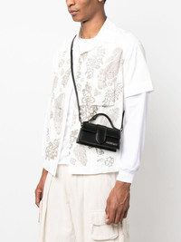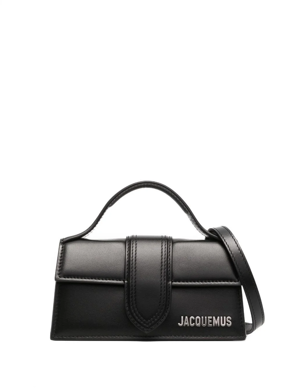Le Bambino leather tote bag Crafted in Italy from smooth calf leather, Jacquemus' Le Bambino tote bag is a cult classic thanks to its miniature shape, structured trapeze silhouette and silver-tone logo lettering accent. Highlights - Black - Leather - Silver-tone logo lettering - Silver-tone hardware - Internal logo patch - Foldover top with magnetic fastening - Adjustable detachable shoulder strap - Single top handle - Main compartment Made in Italy Composition Outer: Leather 100% SIZE & FIT Model measurements Height 6 ft 2 in(1.87 m) Bust/Chest 36.22 in(92 cm) Hips 37 in(94 cm) Waist 27.95 in(71 cm) Measurement DEPTH 2.55 in(6.5 cm) HANDLE 1.57 in(4 cm) HEIGHT 3.54 in(9 cm) WIDTH 6.69 in(17 cm) STRAP 20.86 in(53 cm)