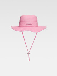FOREVER Large brim bucket hat - Adjustable chin drawstring - Raw edges - Silver JACQUEMUS logo - Sizing below refer to head circumference in centimeter - Similar item from previous collections correspond to size 58 100% Cotton Made in Bulgaria Ref.213AC002-5010-410