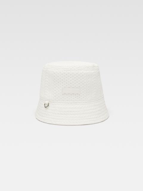 LES SCULPTURES Cable knit bucket hat. - Viscose and knit bucket hat - Cable knit - D-Ring - Leather logo patch - Lined in cotton - Topstitched brim 80% Viscose - 20% Nylon Made in Italy Ref.245AC648-2379-100
