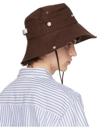 Cotton twill bucket hat in brown. · Logo hardware at face · Mismatched eyelets at sides · Quilted brim with press-stud fastening · Cinch strap at back · Cord-lock chin strap · Poplin lining · Logo-engraved silver-tone hardware Supplier color: Brown Body: 100% cotton. Lining: 80% polyester, 20% cotton. Made in Bulgaria 251553M140017