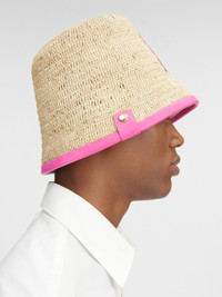 LES SCULPTURES Raffia bucket hat - Woven raffia hat - Short visor - Leather logo patch - Leather piped brim and buckle with gold snap fastener - Topstitching 100% Raffia - 100% Cowskin Made in Madagascar Ref.245AC642-3060-434