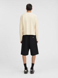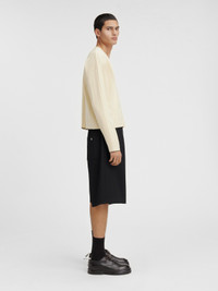 LES SCULPTURES Pleated cardigan - Loose cropped fit - Pleated knit - V-neck - Mother-of-pearl buttons - Contrast hem and sleeves - Ribbed collar and placket The model is 191 cm and wears a size M 88% Viscose - 12% Polyester Made in Portugal Ref.245KN298-2355-115