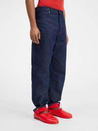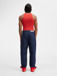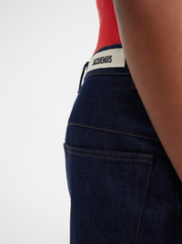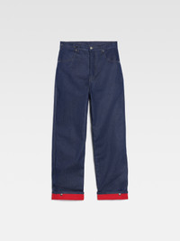 LE CHOUCHOU Snap cuff jeans. - Mid-rise - Straight fit - Raw cotton denim - Belt loops - Button fly - Contrast red quilted lining - Five pockets - Metal buttons and rivets - Grosgrain logo ribbon on the back - Snap button to roll the hem - Contrast stitching The model is 183 cm and wears a size 30. 100% Cotton Made in Italy Ref.236DE022-1015-38B