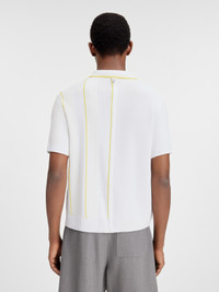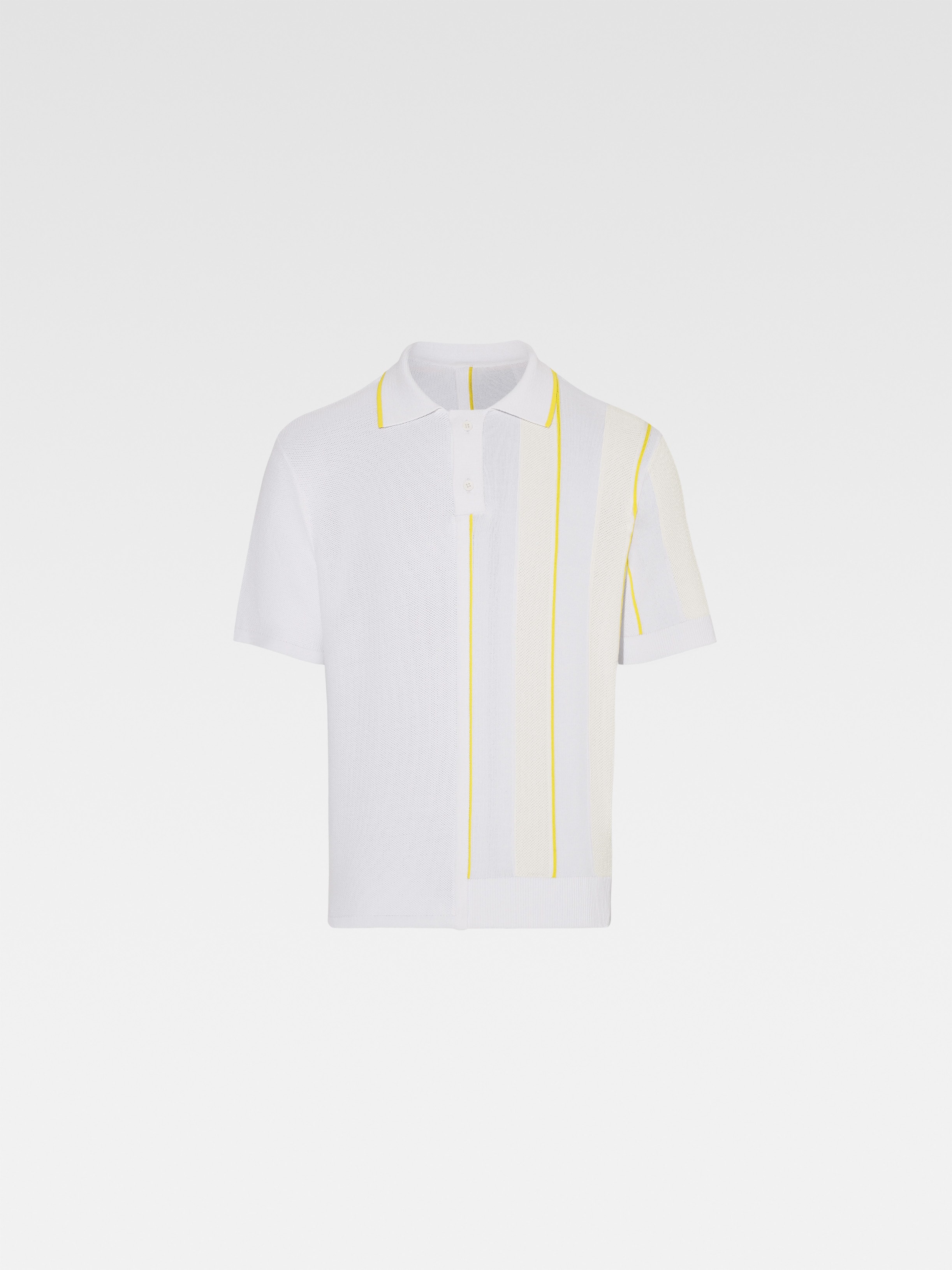 LES SCULPTURES Contrast knit polo - Classic fit - Cotton piqué right side - Striped knit left side - Elbow-length sleeves - Polo collar with mother-of-pearl buttons - D-ring on back The model is 188 cm and wears a size M 70% Viscose - 30% Polyamide Made in Italy Ref.245KN417-2361-100