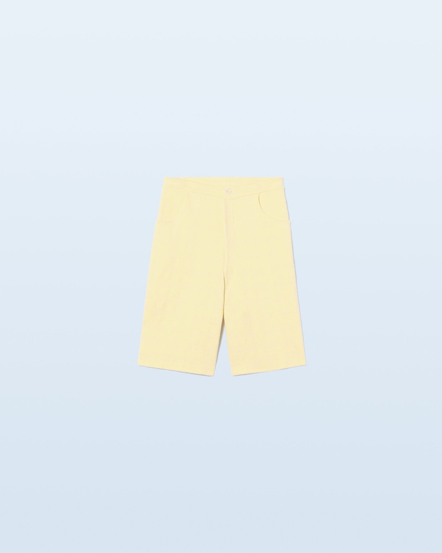 LE SPLASH Lemon jacquard shorts - Relaxed, bermuda fit - Lemon jacquard knit - Hidden zip closure with hook and engraved button - Side pockets - Patch pockets in the back The model is 187 cm and wears a size M 46% Organic Cotton - 32.5% Viscose - 16% Polyamide/Nylon - 5% Polyester - 0.5% Elastane Made in Portugal Ref.225KN034-2039-2AD