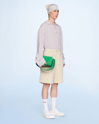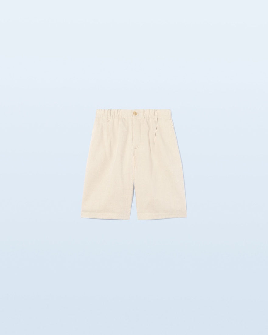 LE SPLASH Pleated shorts - Relaxed fit with sewn pleats - Elasticated mid-rise waist - Belt loops - Hidden zip closure with engraved button - Side pockets - Mismatched back pockets - Back patch pocket with long fastening strap This item is made of OEKO-TEX® fabric that has been checked at every stage of its processing: from raw materials, to yarns, to dyeing. This label guarantees the absence of harmful or allergenic substances. The model is 187 cm and wears a size 48 78% Viscose - 22% Linen Made in Portugal Ref.225PA009-1011-150