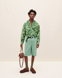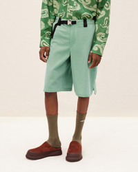 Le Raphia Bermuda ample à cordon - Coupe bermuda décontractée - Taille mi-haute - Viscose sergée fluide - Ceinture en nylon contrasté à fermeture clip en métal gravé - Braguette zippée à agrafe sous patte - Cordon de serrage visible à la taille The model is 185 cm and wears a size 48 55% Virgin Wool - 45% Cotton Made in Bulgaria Ref.235PA032-1323-560