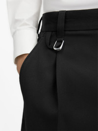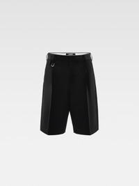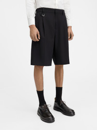 Wide tailored bermuda shorts - Wide, mid-rise bermuda cut - Structured viscose twill - Removable belt with metal buckle - Hidden zip closure with hook and button - “J” belt loop with D-ring - Slant pockets - Pressed pleats - Back welt pockets with a "J" loop button hole The model is 187cm and wears a size 48 100% Virgin wool Made in Bulgaria Ref. 246PA099-1333-990