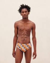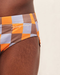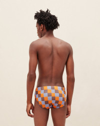 Le Raphia Orange Damier swimsuit - Fitted brief shape - Recycled polyester Orange Damier print - Elasticated drawstring waist - Embroidered logo 80% Biodegradable recycled polyester - 16% Elastane - 4% Polyester Made in Portugal Ref.215PA106-2133-7CL