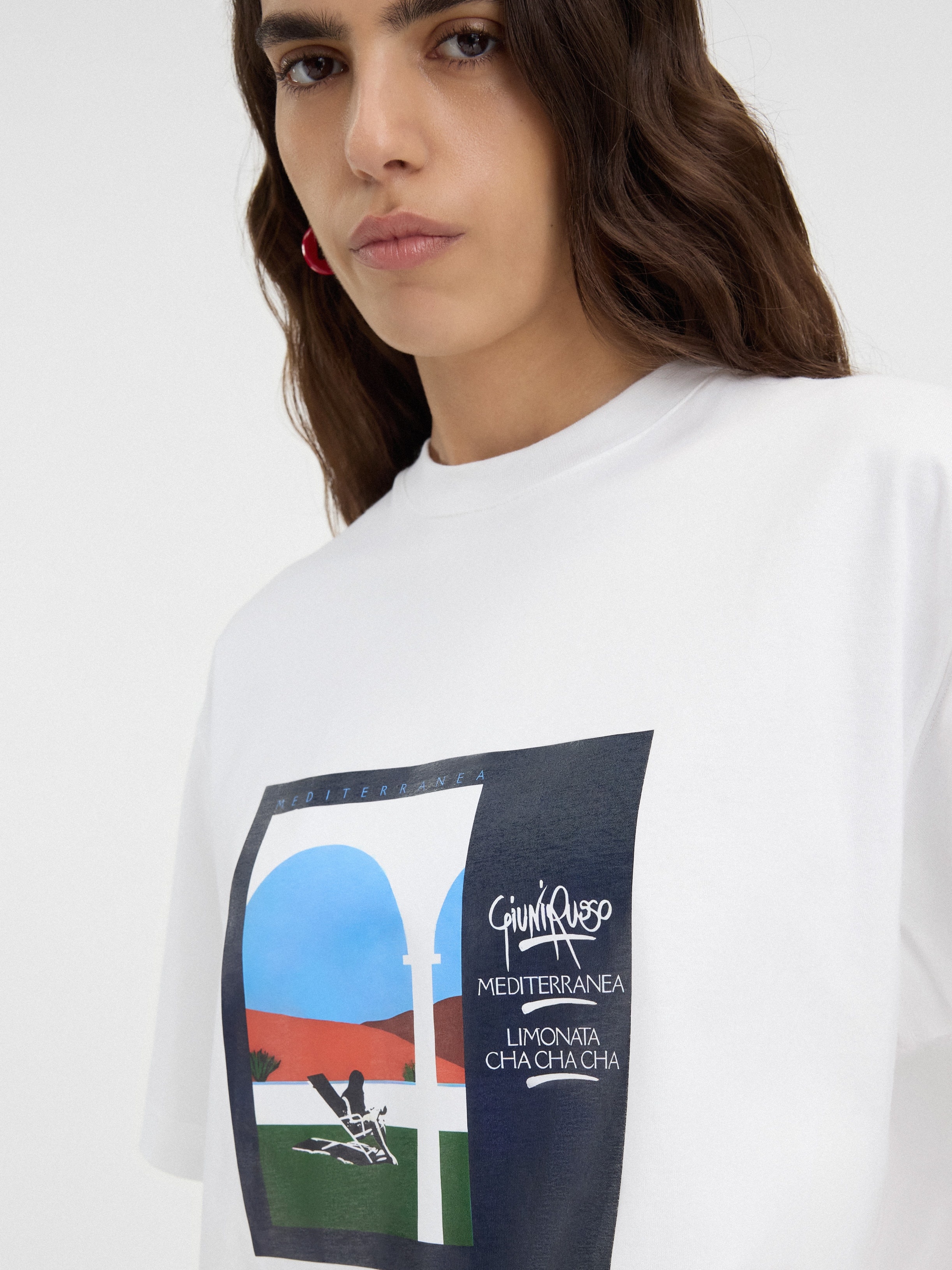 LA CASA "Mediterranea" CD cover T-shirt. - Loose fit - Giuni Russo’s “Mediterranea” CD cover printed cotton - Short boxy sleeves - Ribbed crew neckline - Fisherman logo tag on the back Man: The model is 187cm and wears a size M Woman: The model is 177cm and wears a size M 100% Cotton Made in Portugal Ref. 246JS275-2453-3FI