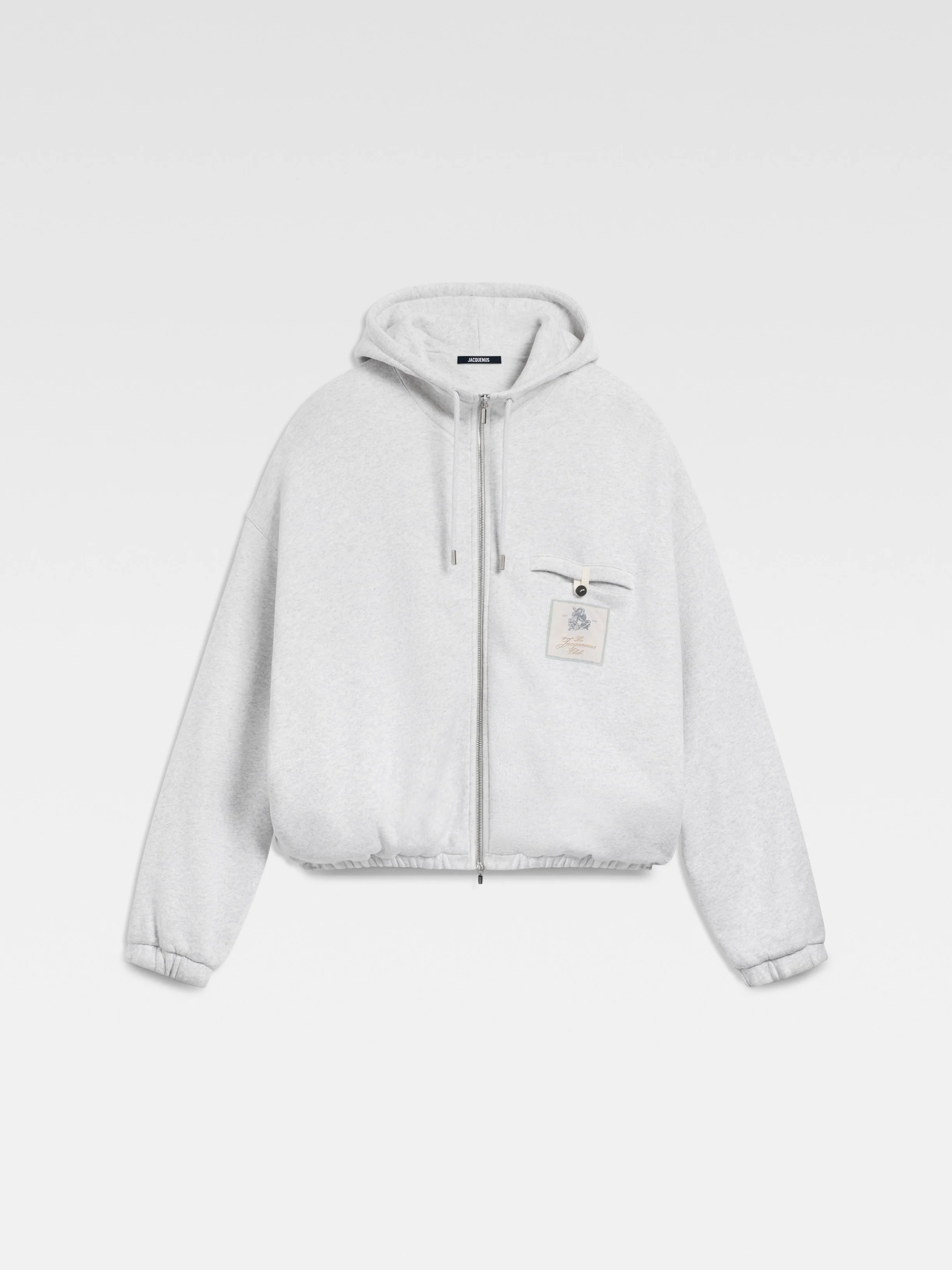 LA CROISIERE Jacquemus Club logo zipped hoodie - Relaxed fit - Mottled cotton fleece - Drawstring hood with engraved circle and square metal tips - Welt pocket with "J" loop and button - Jacquemus Club logo label on chest - Double-sided zip - Side-seam pockets - Elasticated cuffs and hem - Contrast textured logo patch embroidered on back - Fully lined The model is 187cm and wears a size L 100% Cotton / Lining: 100% Cotton Made in Portugal Ref. HOM00302AJ001939CM