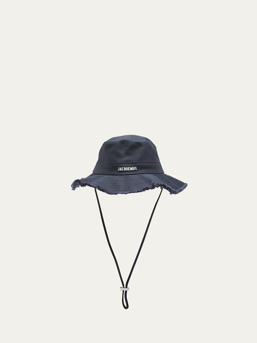 Jacquemus "Le Bob Artichaut" safari hat in cotton with frayed edges Flat crown Stitched brim Metal logo on the front Adjustable chin strap Cotton Made in Bulgaria