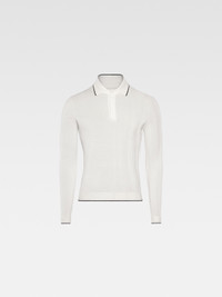 LA CASA Asymmetric long-sleeve knit polo - Fitted shape - Fine cotton knit with asymmetric stripe detail - Polo collar - Button placket with one visible button - Contrast rib collar, cuffs and hem - Mother-of-pearl buttons The model is 188cm and wears a size M 100% Cotton Made in Portugal Ref. 246KN242-2065-110