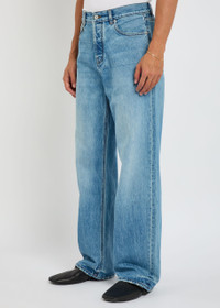Info & Care Jacquemus denim jeans High-rise fit, straight-leg cut, belt loops, five pockets, logo print at back pocket, slightly whiskered, contrasting stitching, distressed and faded finish Partially concealed button fastenings at front 100% cotton Machine wash cold inside out to avoid colour transfer Size & Fit Front rise: 12 inches/ 30.5cm Inside leg length: 31.5 inches/ 80cm Midweight Model is 6'0"/ 182cm and wears a size W32