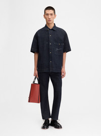 Short-sleeved workwear shirt - Straight boxy fit - Dark navy cotton denim - Boxy elbow-length sleeves - Workwear collar - Contrast cotton loop - Patch pocket with corozo button - Laser printed signature logo - Contrast bartacks and buttons - Embroidered patch on back The model is 185cm and wears a size 48 100% Cotton Made in Italy Ref. 255DE060-1782-390