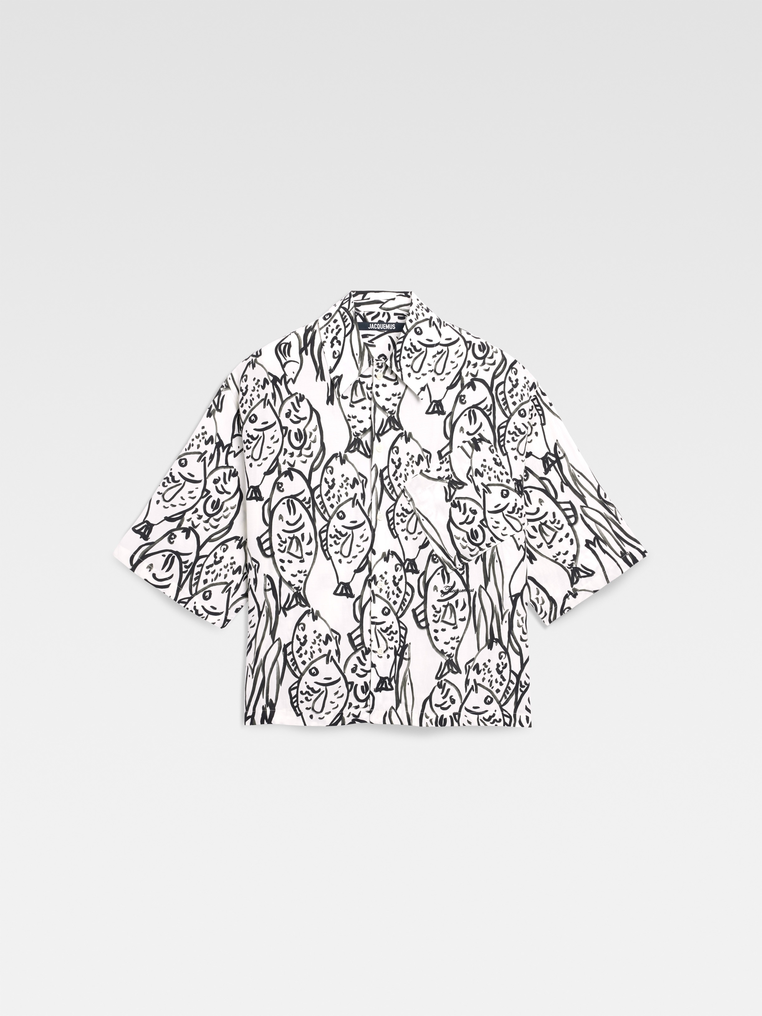 Fish print boxy shirt - Straight, boxy fit - Linen and viscose poplin - Fish print - Pointed collar - Short elbow-length sleeves - Slanted chest pocket - 50’s logo embroidered - “J” locker loop - Back yoke - Corozo buttons The model is 190cm and wears a size 48 50% Viscose - 25% Linen - 25% Rayon Made in Portugal Ref. 255SH123-1752-1IG