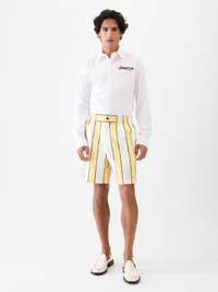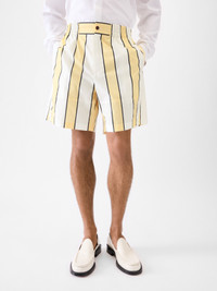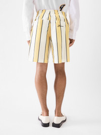 Striped shorts - Boxer effect shorts - Mid-rise waist - Wide knee-length leg - White, yellow and black stripes print - 4 pockets on front and back - Elasticated waistband - Zip fly on front - Visible button on waistband - "Jacquemus" embroidery on back pocket, right side The model is 188cm and wears a size 48 100% Cotton / Lining: 55% Cotton - 45% Polyester Made in Bulgaria Ref. 255PA138-1677-2BM