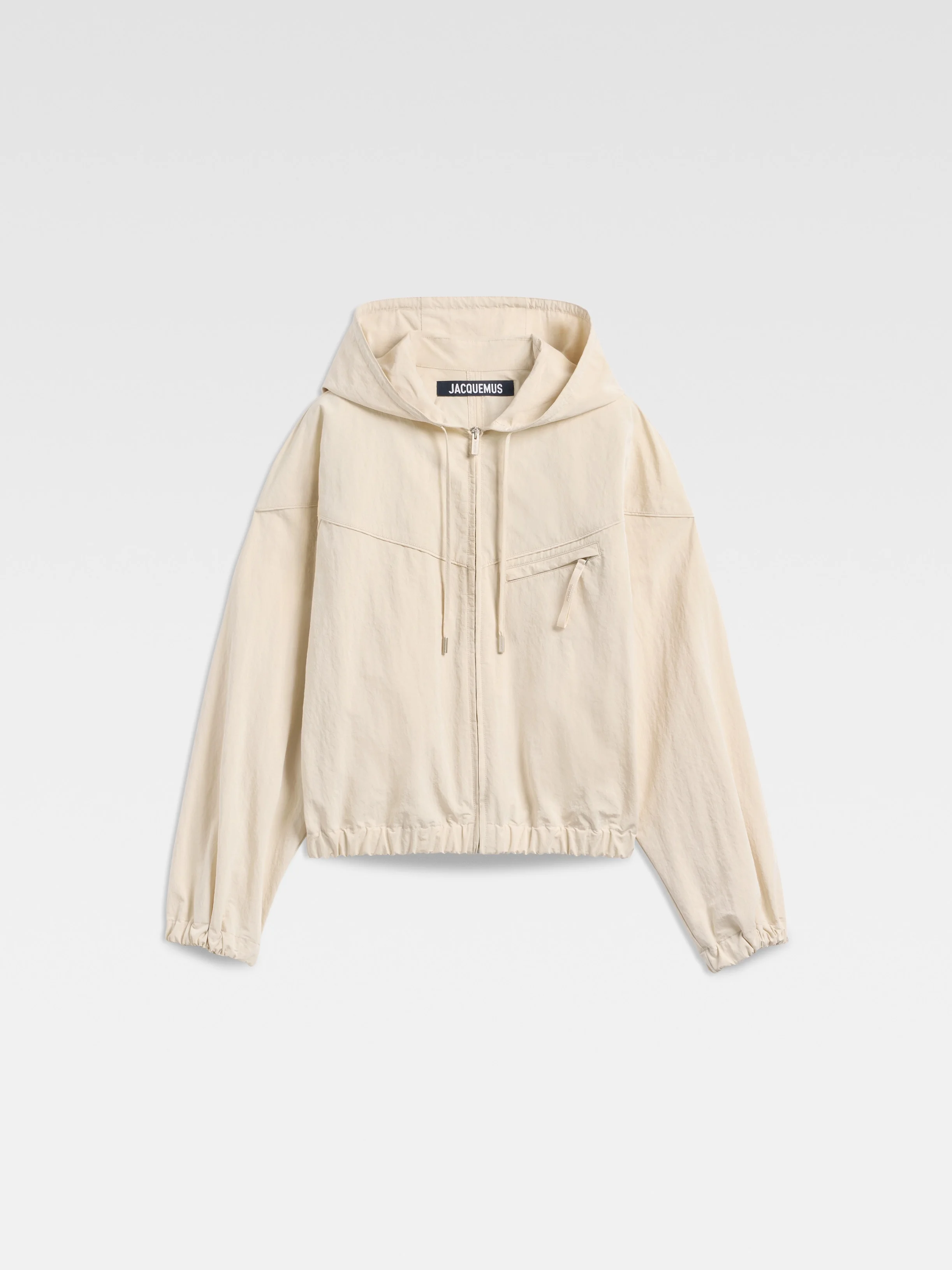 Hooded windbreaker jacket. - Oversized fit - Technical nylon blend - Drawstring hood with circle and square tips - Long sleeves - Zip closure - Chest yoke - Zipped chest pockets with puller - Side-seam pockets - Elasticated hem and cuffs - Jacquemus Club logo label in the back The model is 190cm and wears a size 48 68% Polyamide - 32% Polyester Made in Bulgaria Ref. 255CO064-1714-110