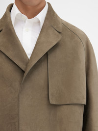 Short leather jacket - Oversized fit - Grained nubuck leather - Tailored collar - Raglan sleeves - Rounded shoulders - Front storm flap - Snap buttons - Removable belt with snap buttons - Belt loops - Side pockets - Embroidered Calisson patch with logo on lower sleeve - Fully lined - Topstitching The model is 185cm and wears a size 48 100% Cow nubuck / Lining: 52% Viscose - 48% Cotton Made in Italy Ref. 255CO065-1739-530