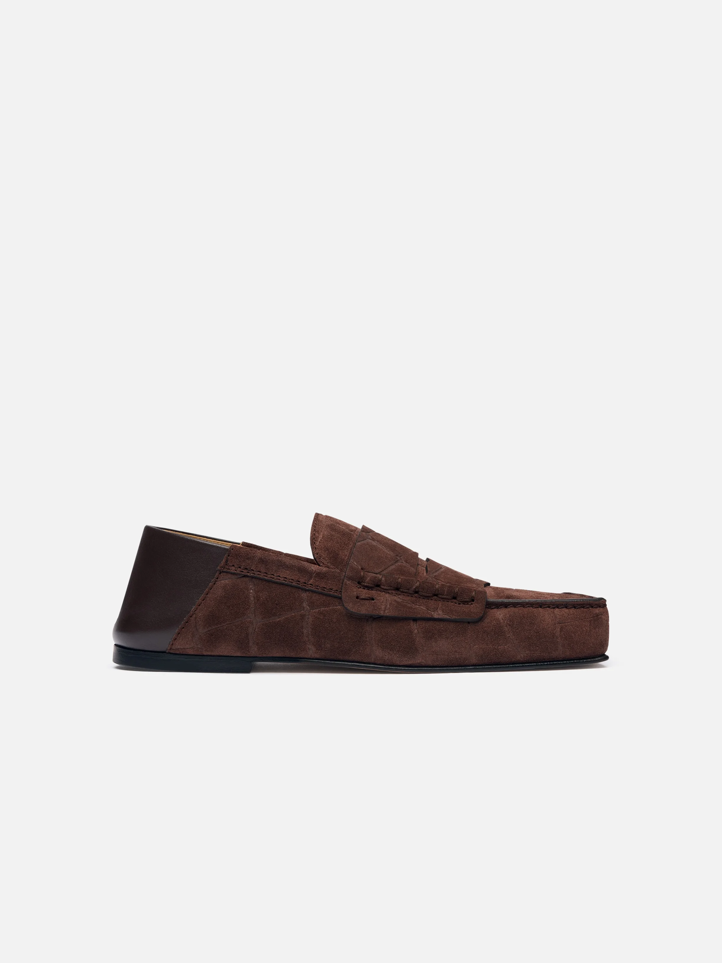 Square loafers - Loafers in crocodile-embossed suede leather - Designed to be worn as a folded mule - Square toe - Wide penny-keeper - Exposed hand-stitched seams - Embossed logo on insole - Lambskin insole and lining with circle and square cushions - Leather sole To protect the leather soles of all shoes, a transparent protective film has been applied to each sole. To remove it, please follow the direction of the arrow in order not to damage the leather sole. 100% Calfskin / Sole: 100% Cowskin Made in Italy Ref. 246FO147-4355-880
