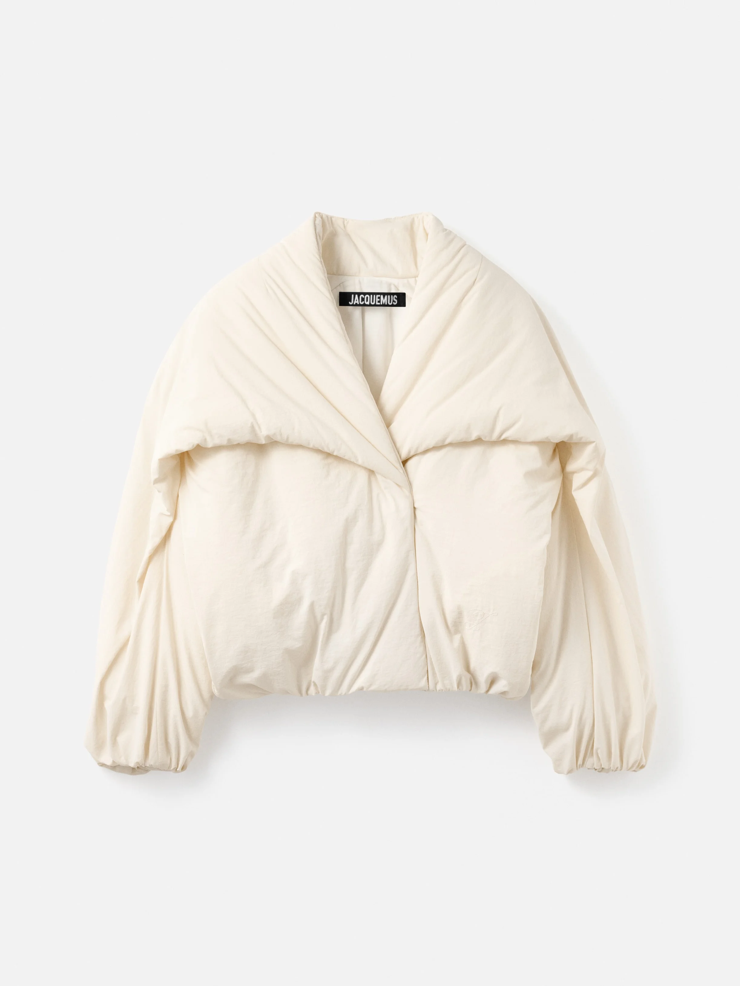 Shawl bomber - Cropped fit - Creased technical blend - Collarless - Folded shawl shape on the front - Hidden snap button placket - Embroidered “J” on the side - Internal ribbed hem and cuffs - Embroidered label on the back The model is 176cm and wears a size 34 96% Polyamide - 4% Polyurethane / Lining: 100% Cotton Made in Tunisia Ref. OUW00123AW00645100